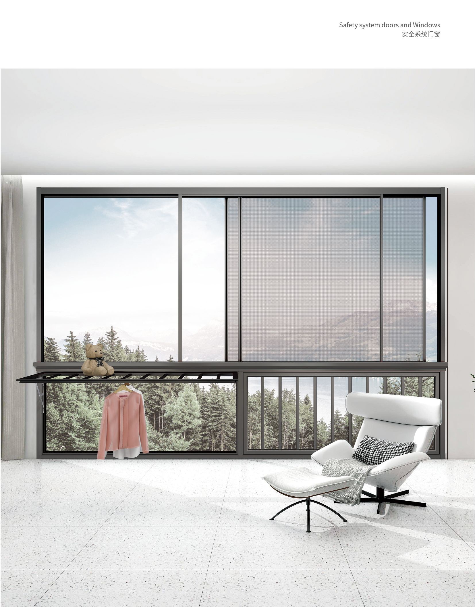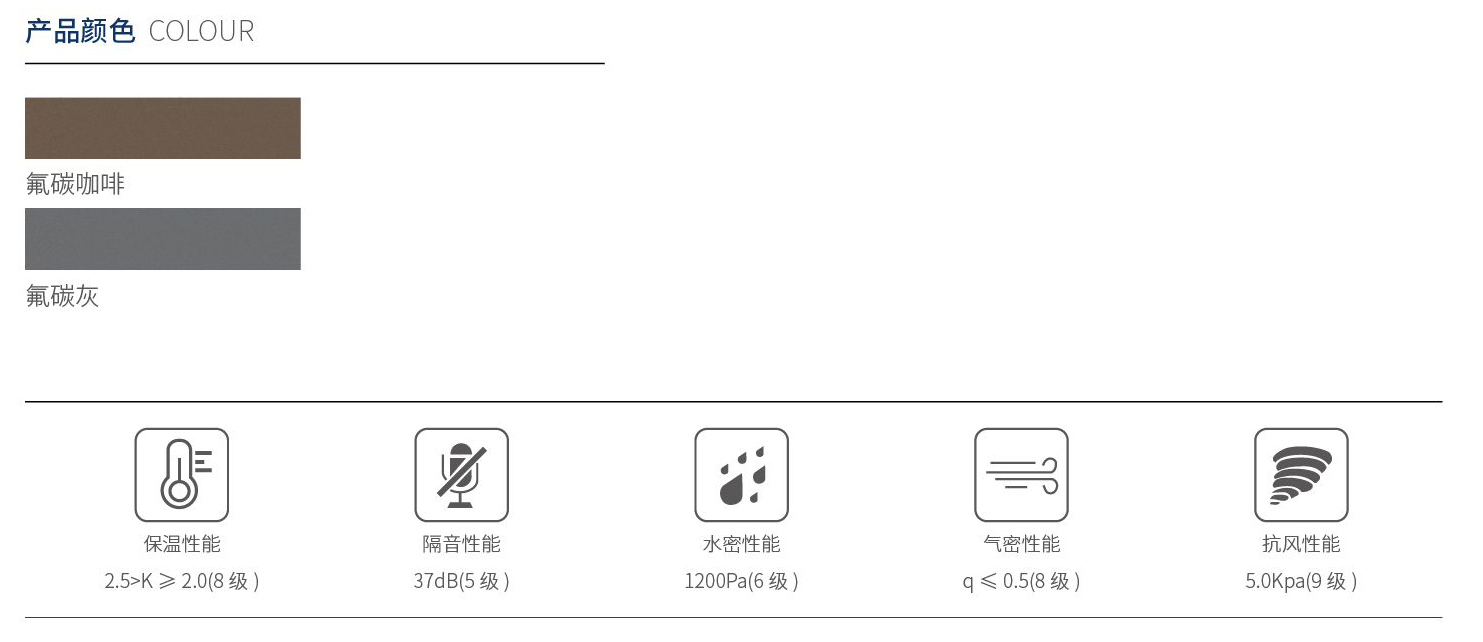 产品配置 TO CONFIGURE 边框宽度/Frame:130mm 型材壁厚/Wall thickness:1.8mm 胶条配置 /Rubberstrip:采用汽车级发泡胶条 玻璃配置 /Glass:信义玻璃 5+15A+5 隔热保温系统 THERMALINSULATION SYSTEM 隔热条 /nsulation strip:国标 PA66GF20 隔热条 热导率/Thermal conductivity:0.30W/(m·k) 五金开启系统 HARDWARE OPENING SYSTEM 开启系统/Open the system:B0G0(宝高)五金 承重系统/Load bearingsystem:承重>60KG